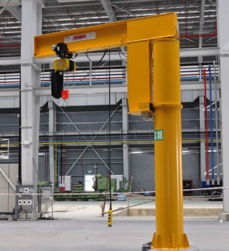 懸臂起重機(jī)工作強(qiáng)度為輕型,起重機(jī)由立柱,回轉(zhuǎn)臂回轉(zhuǎn)驅(qū)動裝置及電動葫蘆組成,立柱下端通過地腳螺栓固定在混凝土基礎(chǔ)上,由擺線針輪減速裝置來驅(qū)動旋臂回轉(zhuǎn),電動葫蘆在旋臂工字鋼上作左右直線運(yùn)行,并起吊重物。起重機(jī)旋臂為空心型鋼結(jié)構(gòu),自重輕、跨度大、起重量大、經(jīng)濟(jì)耐用。